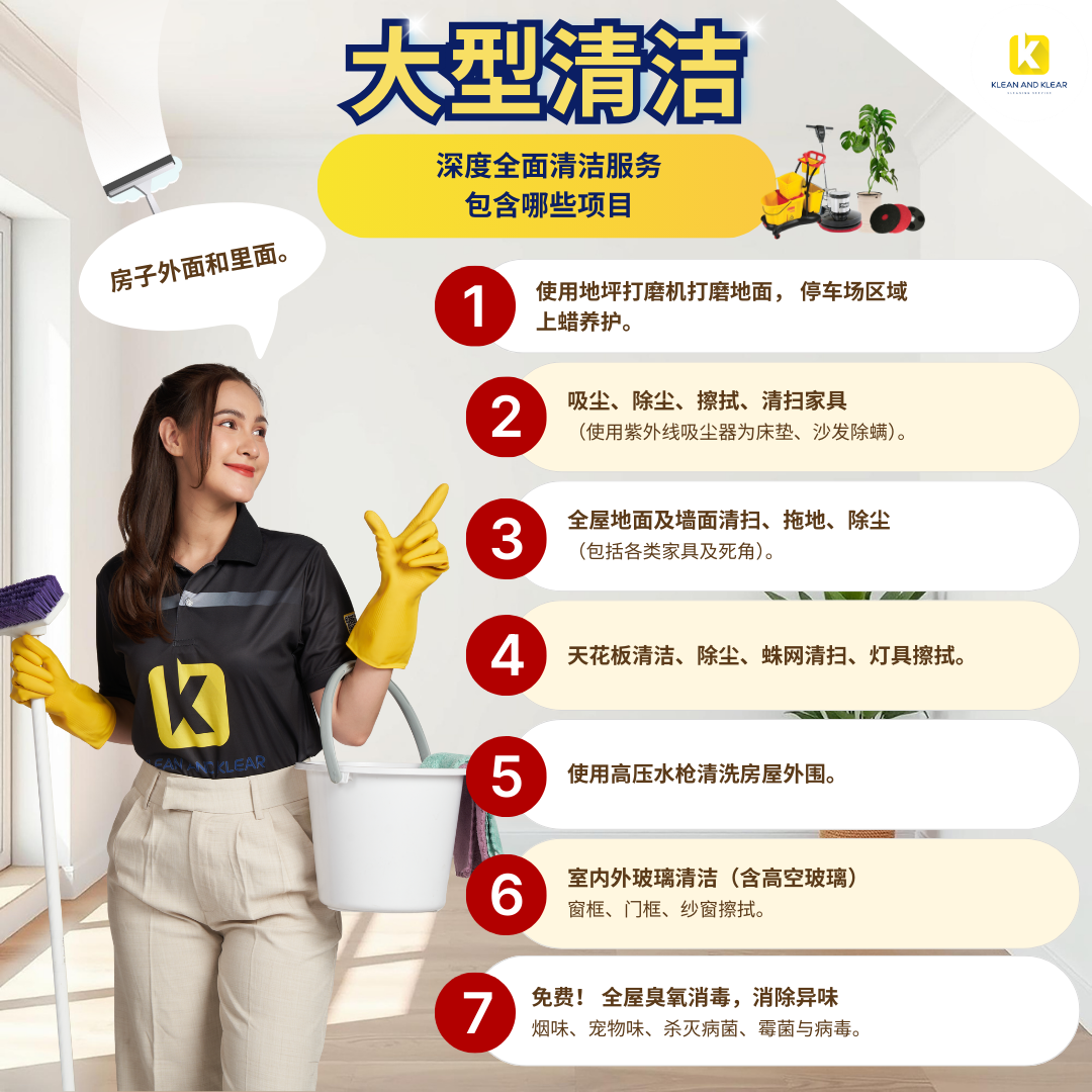 大型清洁 (Big Cleaning) 服务——承接各类建筑大型清洁项目涵盖住宅、新房、翻修房、扩建房、长期空置房、联排别墅、工厂、办公室、餐厅、商铺、展厅、仓库、食堂及年度保洁。无论何种空间与建筑类型,我们均能提供彻底清洁服务,包括:玻璃清洁、地面清洗、地板打磨抛光打蜡、屋顶清洁、油漆/水泥/胶渍清除,以及各类灯具清洁。